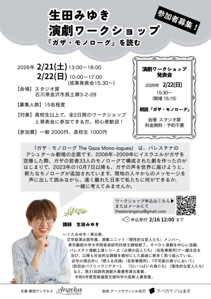 『ガザ・モノローグ The Gaza Mono-logues』は、パレスチナのアシュタール劇場の企画です。2008年~2009年にイスラエルがガザを空爆した際、ガザの若者33人のモノローグで構成された劇を作ったのがはじまりで、2023年の10月7日以降も、ガザの声を世界に届けようと、新たなモノローグが追加されています。現地の人々からのメッセージを声に出して読みながら、遠く離れた日本で私たちに何ができるか、一緒に考えてみませんか。