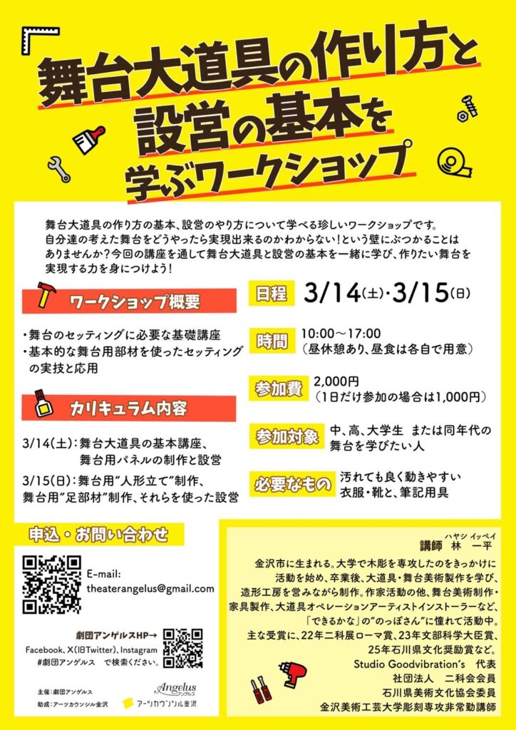 自分達の考えた舞台をどうやったら実現出来るのかわからない!という壁にぶつかることはありませんか?今回の講座を通して舞台大道具と設営の基本を一緒に学び、作りたい舞台を実現する力を身につけよう!
